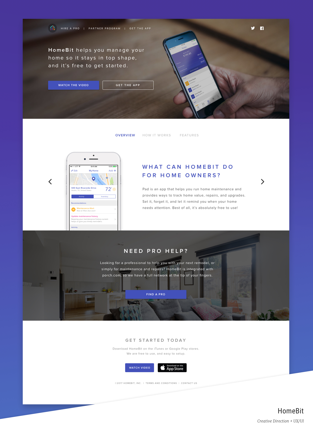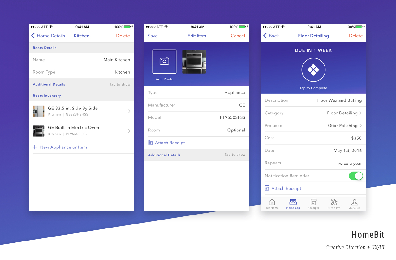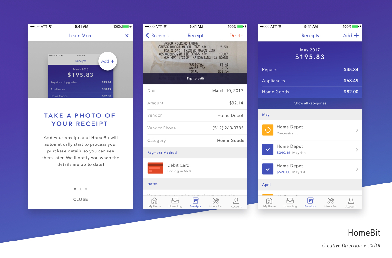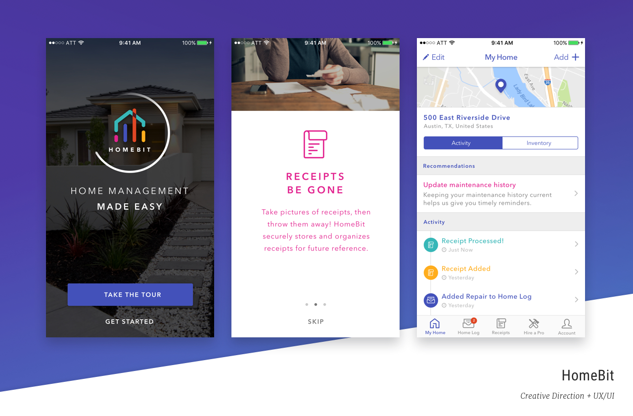 HomeBit is an app for homeowners that helps them manage details, repairs, and receipts. I worked as a Creative Director with the Head of Product to design the experience from a UX and Creative role.