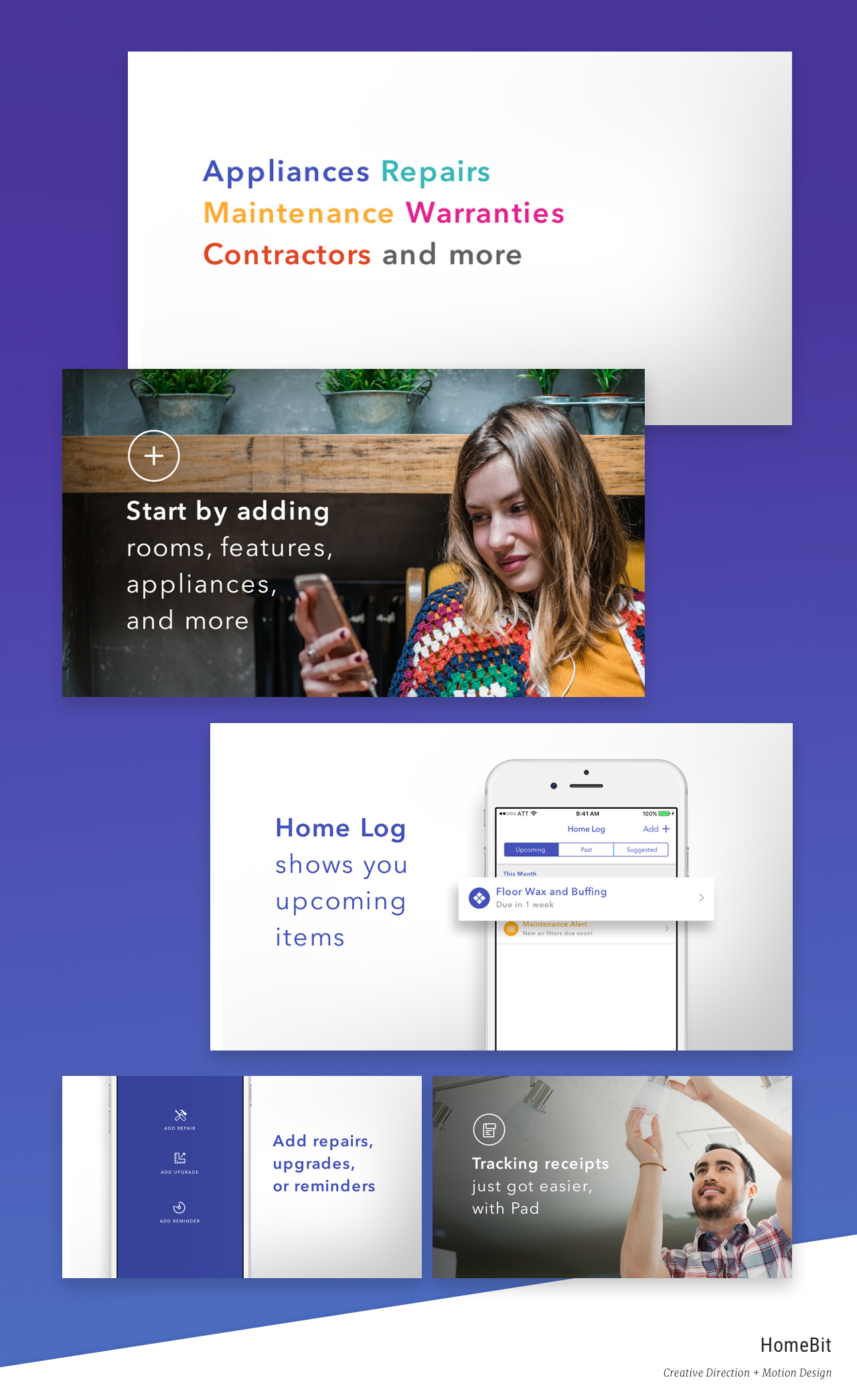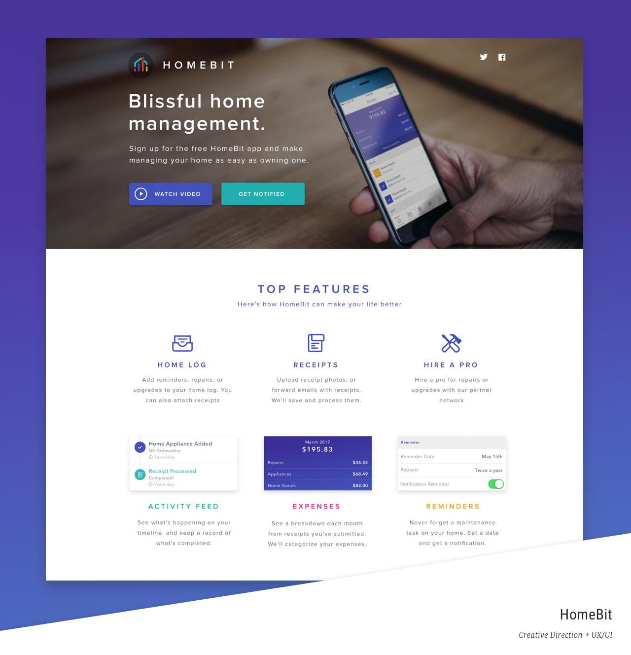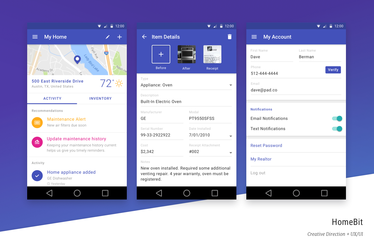 HomeBit is an app for homeowners that helps them manage details, repairs, and receipts. I worked as a Creative Director with the Head of Product to design the experience from a UX and Creative role.