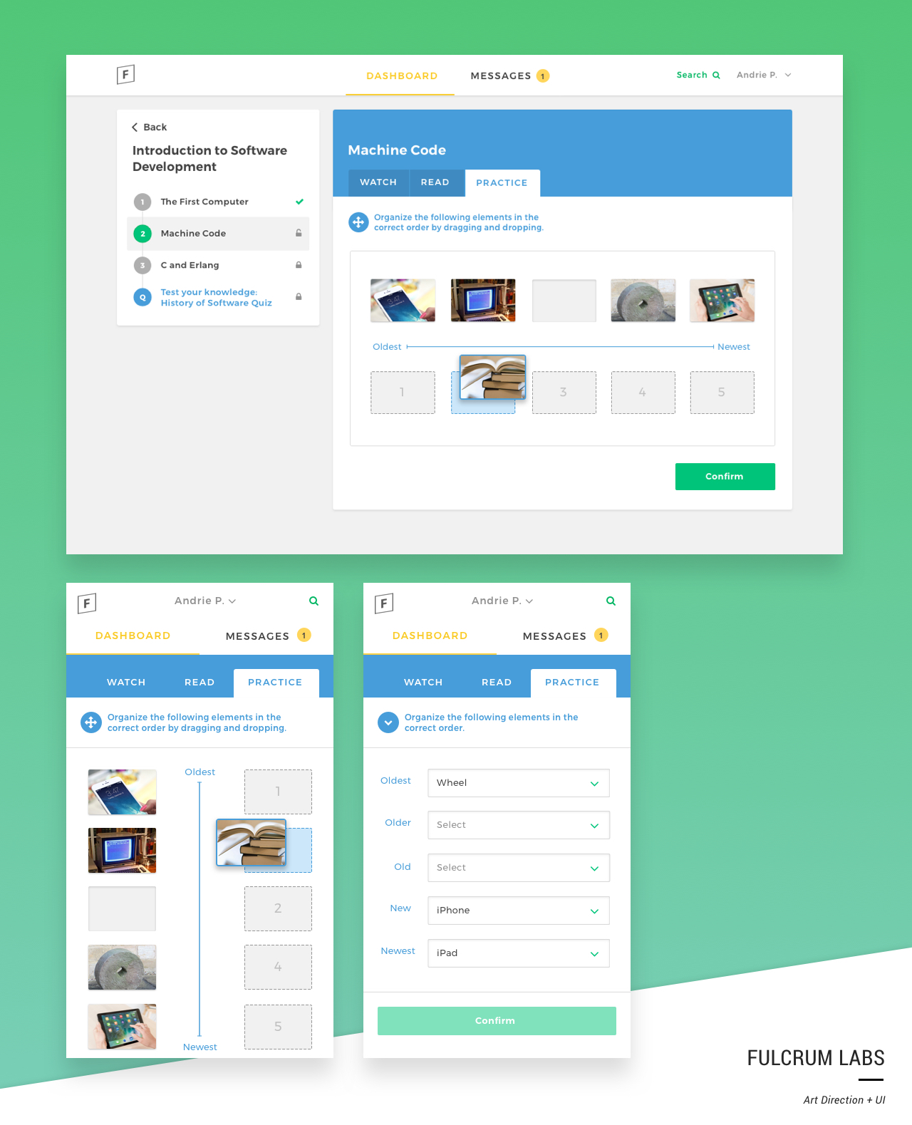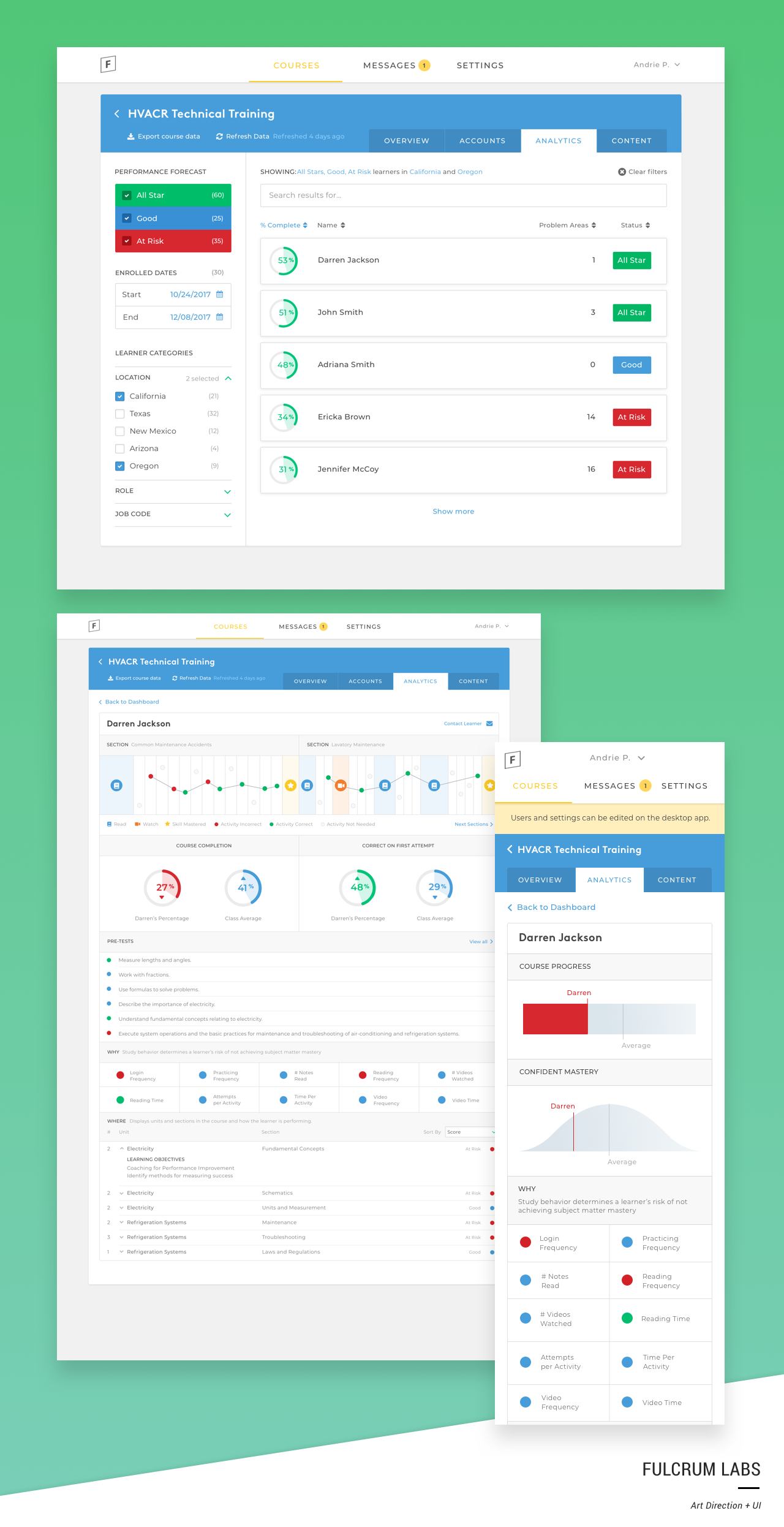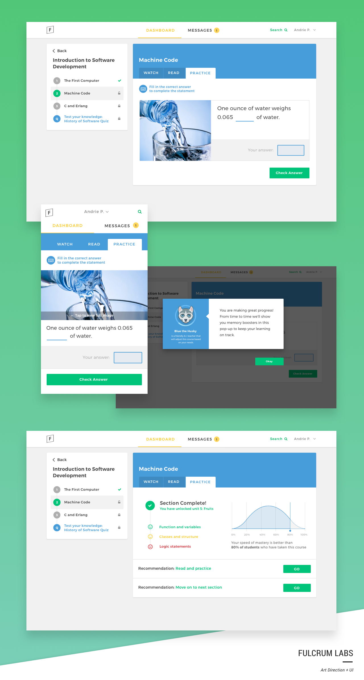 The Fulcrum Labs UI was designed over the course of a year to empower educators to facilitate a better learning experience. The student desktop and mobile platform was refreshed along with Admin and Teacher dashboards which include class management, advanced analytics, and student-level insights.