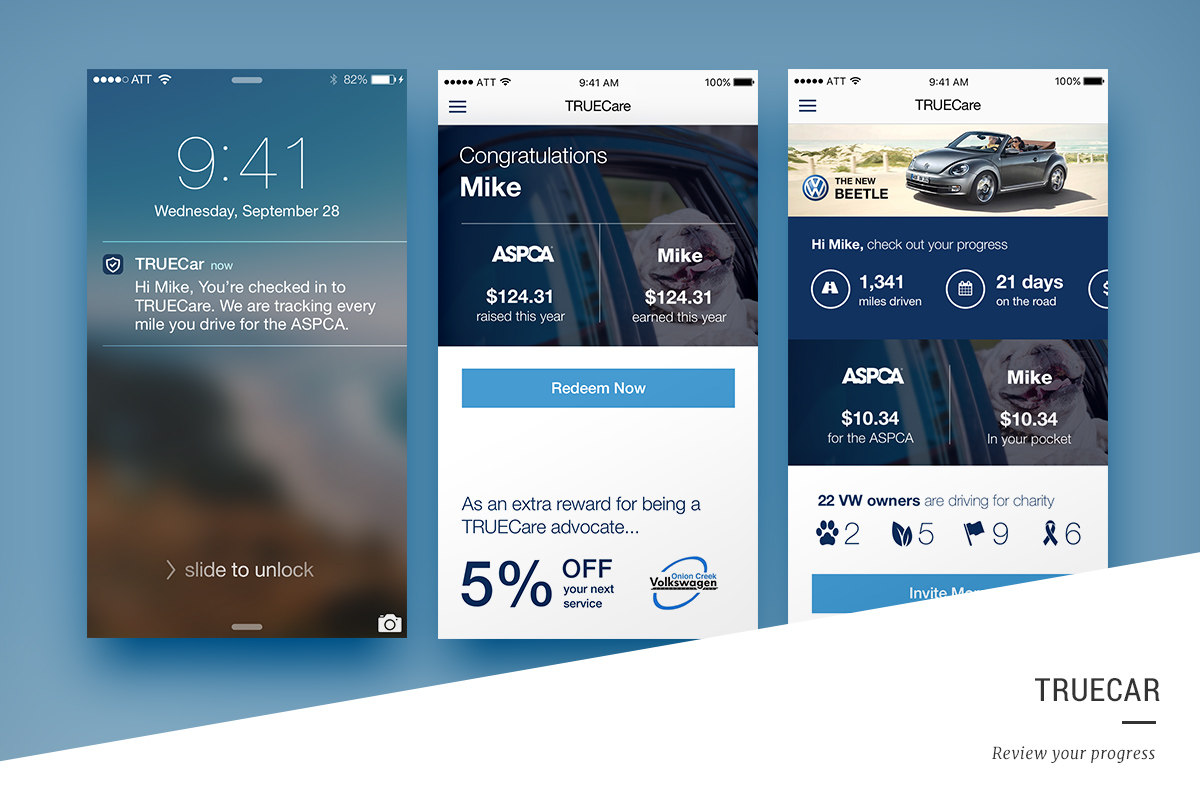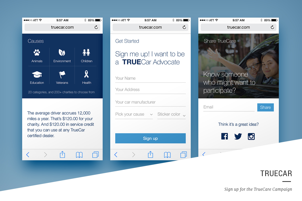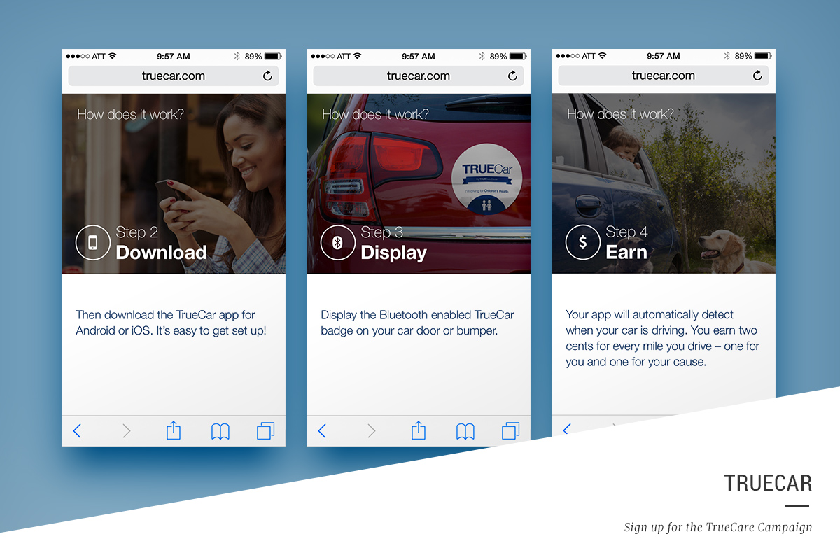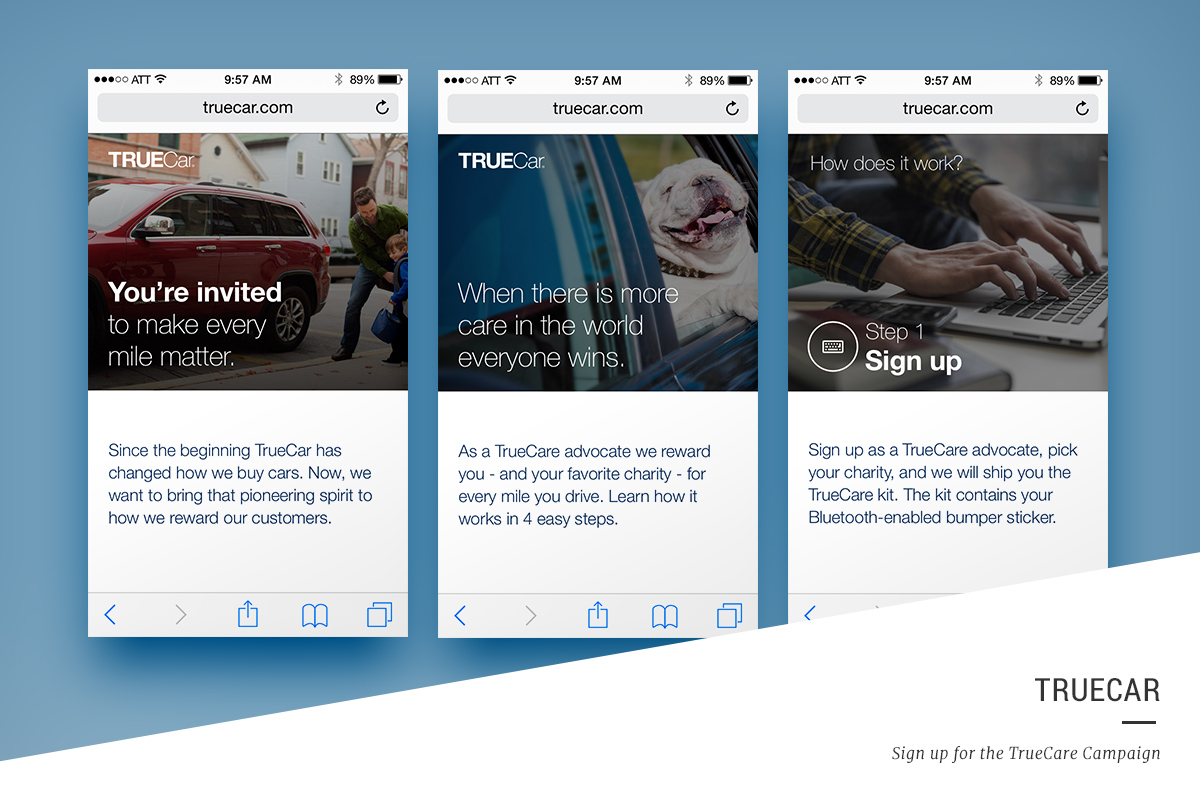 TRUECar worked with argo design to conceptualize a digital campaign concept. The TRUECare campaign was designed to integrate with driver technology which tracked miles and donated to a charity of the drivers choice, all while promoting the TRUEcar brand and mission.